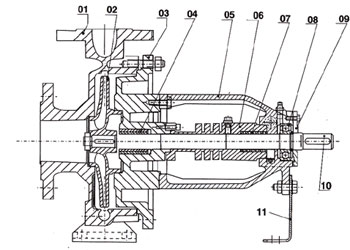RY热油泵的结构大致分为两种:一种是中心支撑结构,另一种是脚支撑结构。且热油泵泵体的进口与出口方向不在一条水平线上,进口为轴向吸入,出口为中心垂直向上。热油泵整机共分为三部分:泵头,底座,电机。泵头与电机用弹性联轴器相连接,并一同固定在底座上。
